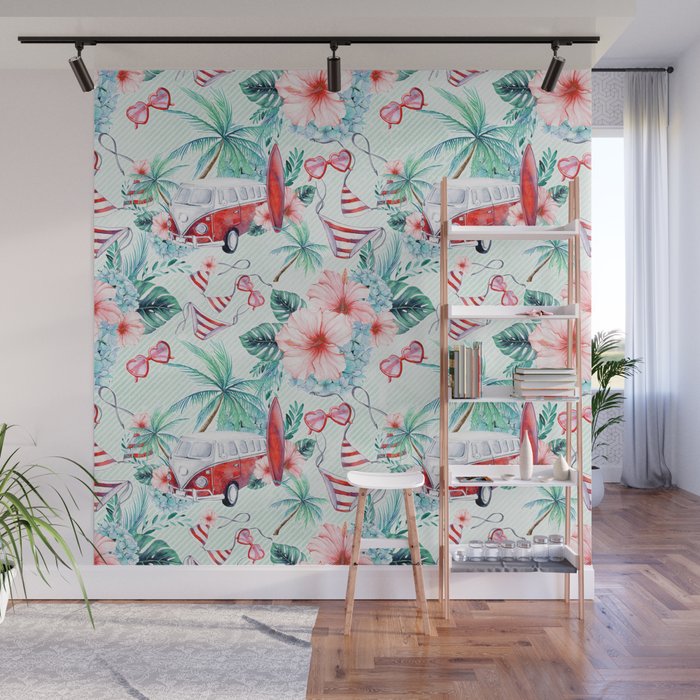 Retro 60s Bus Surfboard Bikini Palm Trees Beach Scene Wall Mural By Dazzettemarie