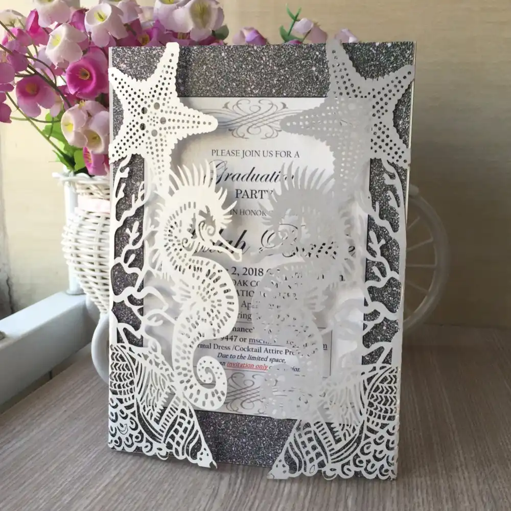 50pcs Lot Wedding Invitation Card Wedding Cards Invitation 2018 Latest Laser Cut Sea Horse Beach Theme Wedding Supplies